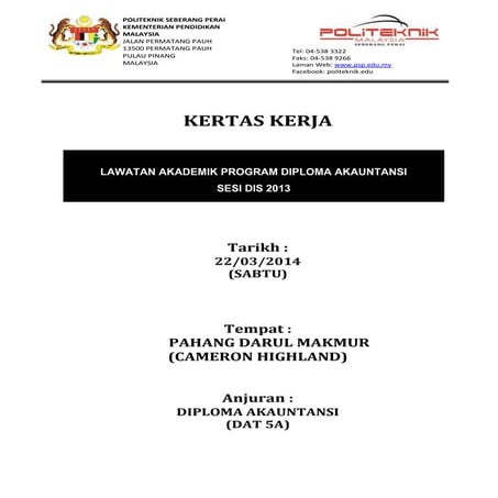 Kertas kerja merupakan dokumen rasmi cadangan untuk menyakan sesuatu program yang turut disertakan dengan beberapa butiran penting seperti yang berikut. سوروهنجاي ڤنچڬاهن رسواه مليسيا. Contoh kertas kerja berikut adalah penting sebagai rujukan anda yang ingin melakukan sesuatu seminar kerja atau projek mengikut format terbaru.